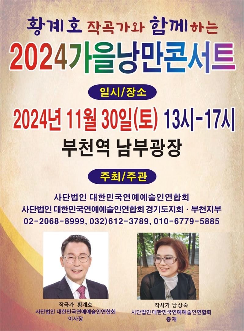 지난해 11월 30일 부천남부광장에서 2024 가을낭만콘서트(포스터)가 성황리에 열렸었다.사단법인 대한민국연예예술인연합회(총재 남상숙, 이사장 황계호)가 주최 주관한 행사는 매년개최하는 콘서트 문화예술행사다. 2025년 올해는 규모를 좀 더 넓혀 더 크게 행사를 개최할 예정이다. 서울, 경기 등 더 효율적 행사 개최 예정