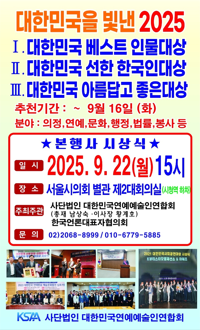 9월 22일 15시 서울시의회 별관 제2대회의실에서 사단법인 대한민국연예예술인연합회(총재 남상숙, 이사장 황계호), 한국언론대표자협의회가 주최 주관하는 2025 대한민국을 빛낸 베스트 인물대상, 선한 한국인대상, 아름답고 좋은대상 시상식행사에 지역사회를 빛낸 쟁쟁한 얼굴들이 추천되고 있다.